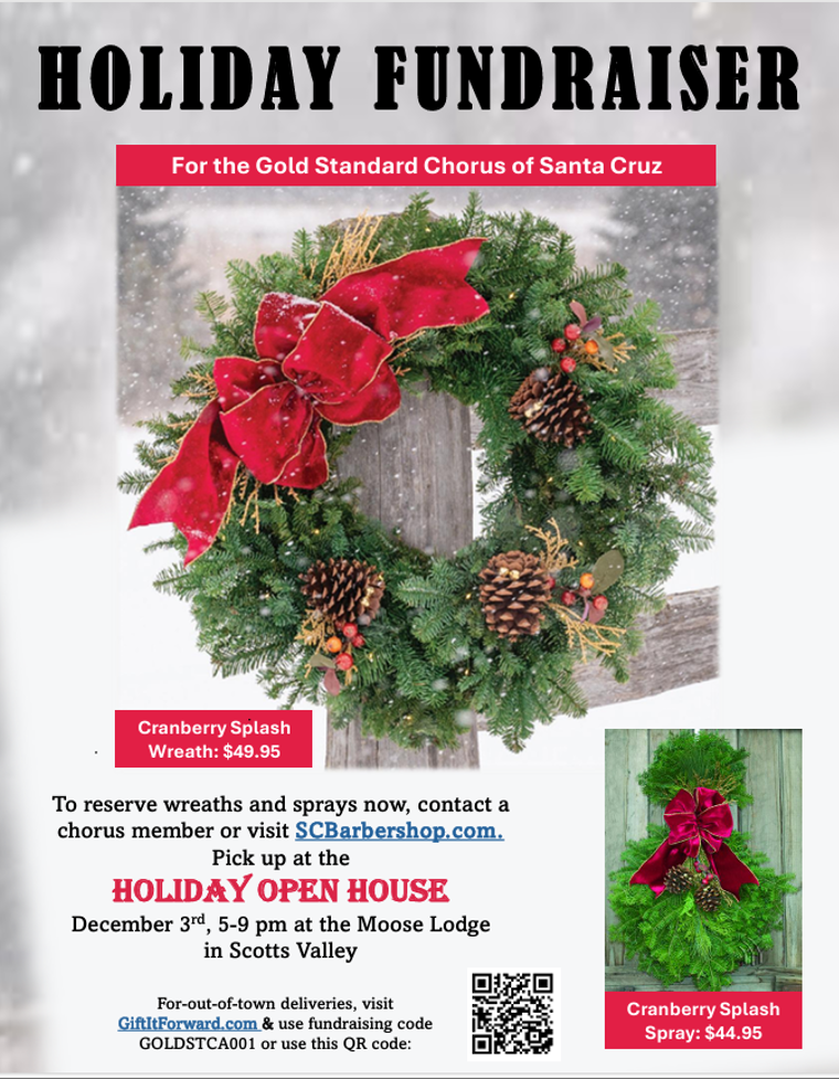 We’ll contact you again before the pickup event, which will be held at our annual Holiday Open House, December 3rd, 5- 9pm at the Moose Lodge in Scotts Valley. Pay in advance with a chorus member, or upon pickup at the Holiday Open House.